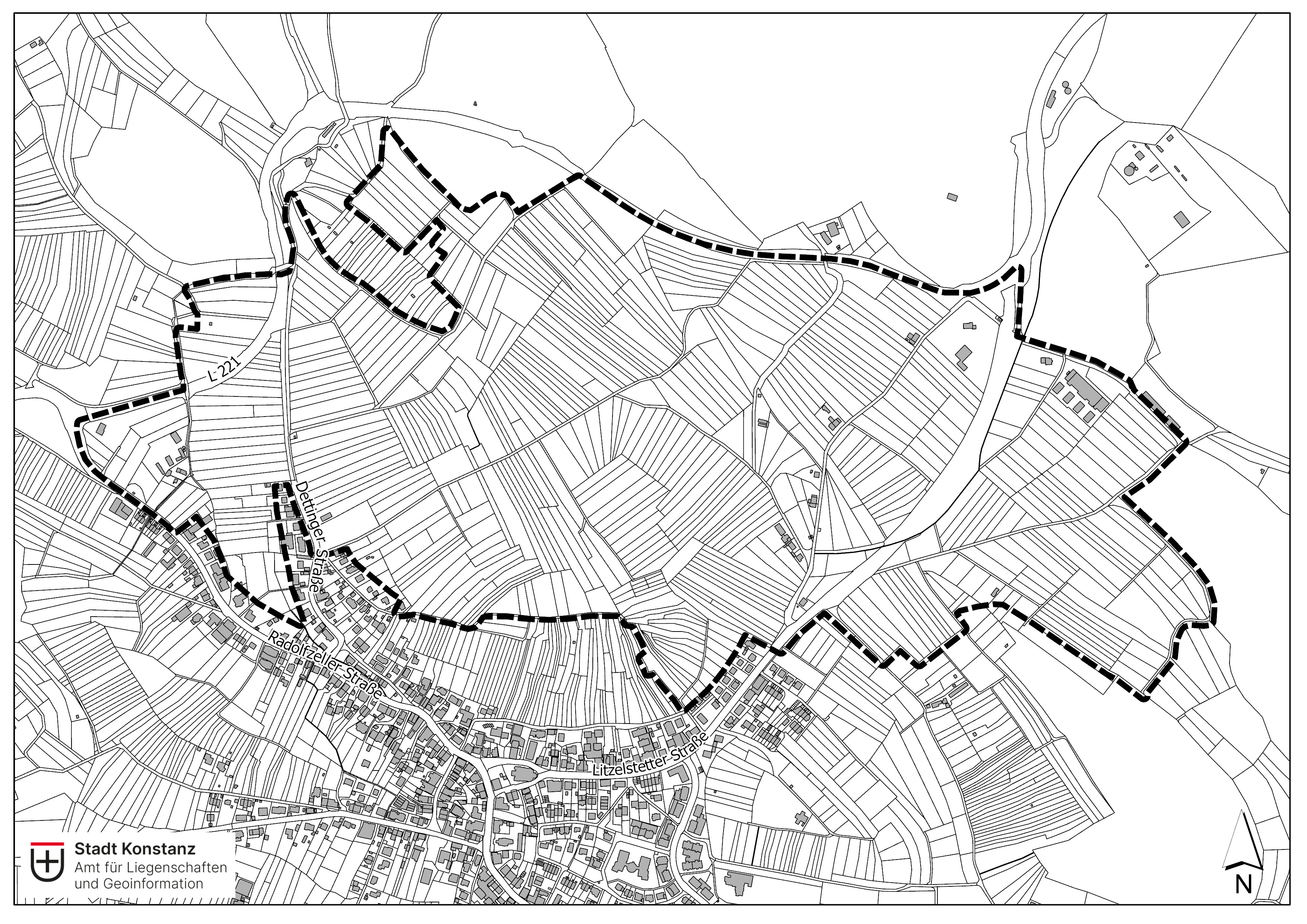 - Im Südwesten verläuft die Grenze bis zum Siedlungsrand entlang der Radolfzeller Straße, und wird dann entlang des Siedlungsrande am Giratsmoosbach weitergeführt, spart die Bestandsbebauung entlang der Dettinger Straße aus und verläuft außerhalb der Bestandsbebauung bis zum Hafner-Drumlin, quert diesen mittig und verläuft hinter der Bebauung bis zur Litzelstetter Straße.