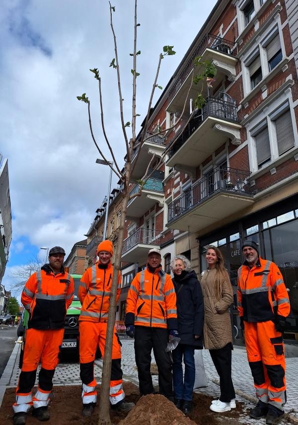 Hitzeresiliente Bäume für die Bodanstraße: Mitarbeiter der Technischen Betriebe Konstanz (TBK) haben auf dem nördlichen Randstreifen der Bodanstraße vier Bäume gepflanzt. Die rund vier Meter hohen Gewächse sind besonders hitzeresilient. Die Auswahl dieser Bäume trägt damit in besonderem Maße den Herausforderungen des Klimawandels Rechnung. Das Baumquartett ist Teil der Randstreifengestaltung im östlichen Abschnitt der Bodanstraße, die im Rahmen der Bahnhofplatz-Sanierung neu asphaltiert wurde. Unser Bild zeigt von links: Claudius Streibert, Lukas Kirn, Werner Wermuth (TBK), Anja Gabor und Kateryna Kurepina (ASU) sowie Isamil Marovic (TBK).