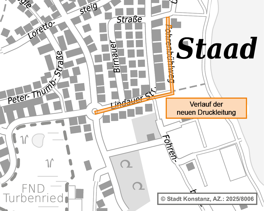 Diese Druckleitung ist im Sommer 2024 gerissen, im Anschluss wurde der betroffene Abschnitt ersetzt. Um die Betriebssicherheit der Leitung und damit die sichere Abwasserableitung langfristig zu gewährleisten, wird die Druckleitung im Auftrag der Entsorgungsbetriebe Stadt Konstanz (EBK) nun auf der gesamten Länge erneuert. Die Arbeiten beginnen im Juli und können voraussichtlich im Oktober 2025 abgeschlossen werden.