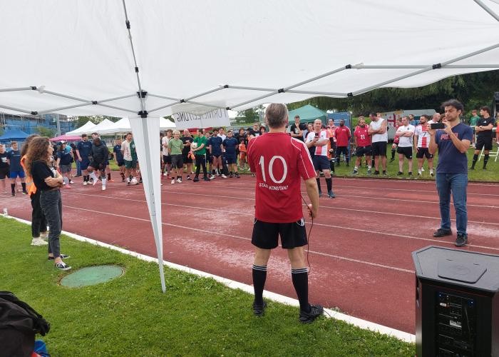 Die Fußballbegeisterten fanden sich am Morgen für das Turnier zusammen und wurden von Leonie Reichle vom Vorstand des Café Mondials begrüßt. Sie verwies in Ihrer Rede darauf, dass Rassismus und Diskriminierung nicht nur im Sport trauriger Alltag für viele Menschen seien und hob dadurch die Bedeutung der Veranstaltung hervor. Nach ihr begrüßte Bürgermeister Dr. Andreas Osner die Teilnehmenden und Gäste von Seiten der Stadt. Mit Blick auf die Ergebnisse der vergangenen Wahlen am 09. Juni zeigte er sich hoffnungsvoll was die Zustimmung für demokratische Werte in der Stadt Konstanz angeht. Er appellierte jedoch an alle sich tagtäglich für die Demokratie und den sozialen Zusammenhalt einzusetzen und bedankte sich herzlich bei den Veranstaltenden für die Organisation des Turniers. „Mit Ihrem Engagement macht ihr unsere Stadt zu einer gelebten internationalen und weltoffenen Stadt“, so Bürgermeister Dr. Andreas Osner, welcher sich daraufhin warm für das Spiel in der städtischen Mannschaft machte.