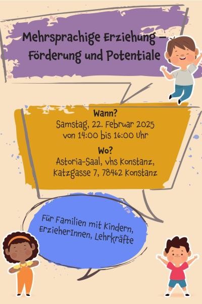 Das Programm beginnt um 14:00 Uhr mit einem wissenschaftlichen Vortrag des Zentrums für Mehrsprachigkeit, der praktische Tipps und Ansätze zur Förderung von Mehrsprachigkeit vermittelt. Im Anschluss laden Sprachschulen aus Konstanz an interaktiven Sprachstationen zu individuellen Beratungen, Sprachspielen und weiteren Aktivitäten ein. Die Veranstaltung richtet sich an Eltern, Kinder, ErzieherInnen, Lehrkräfte und alle Interessierten. Für das leibliche Wohl ist gesorgt.