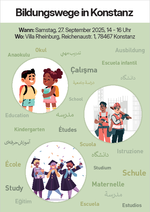Die Veranstaltung „Bildungswege in Konstanz“ bietet eine umfassende Orientierung für SchülerInnen und Schüler, Eltern und Interessierte zu den vielfältigen Bildungsangeboten in der Region. Ein Vortrag, Informationsstände und persönliche Beratungen geben wertvolle Einblicke in die gesamte Bildungslandschaft – von der KiTa und Grundschule bis zu weiterführenden Schulen und beruflichen Ausbildungsmöglichkeiten. Teilnehmende werden dabei unterstützt, den passenden Bildungsweg leichter zu finden und die Vielfalt der Bildungsoptionen in Konstanz besser zu verstehen.