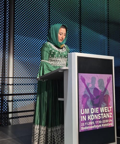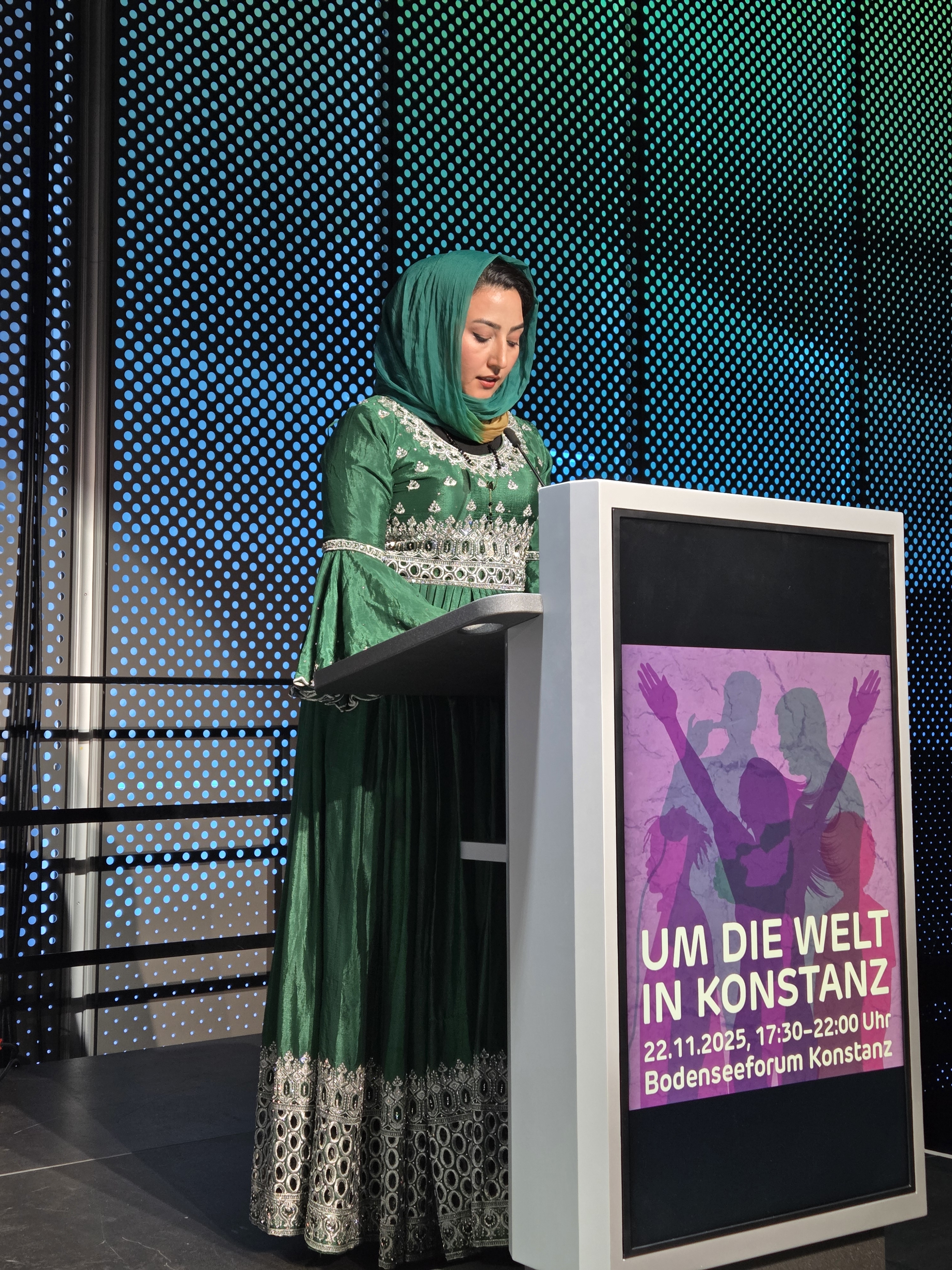 Eröffnet wurde der Abend durch Massa Dembele, der mit seiner Djembe für eine stimmungsvolle Atmosphäre sorgte, gesanglich begleitet von Lisa Reininghaus. Der Leiter der Stabsstelle Konstanz International Dr. David Tchakoura schlüpfte in die Rolle des Moderators und führte das Publikum charmant und unterhaltsam durch den Abend. Nach einer Begrüßung des Sozialbürgermeisters, in der er die Bedeutung von Zusammenhalt und interkulturellem Austausch betonte, folgten im ersten Teil des Abends interessante lyrische Beiträge beispielweise zum Thema Frau sein zwischen verschiedenen Kulturen, chinesische, afghanische oder iranische Traditionen.