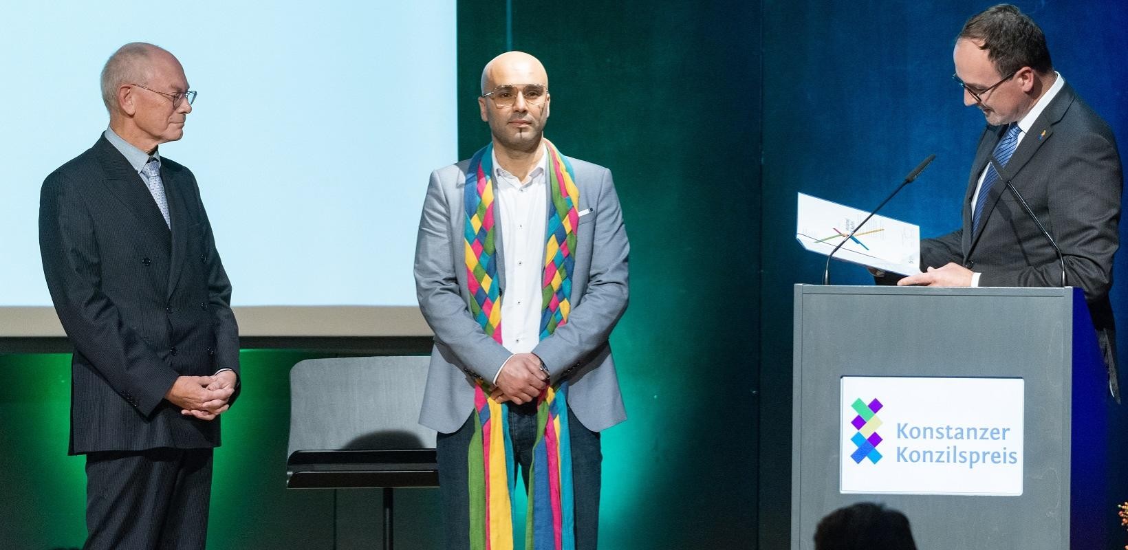 Oberbürgermeister Uli Burchardt konnte zu Beginn der Veranstaltung rund 400 Besucherinnen und Besucher begrüßen. Er erinnerte in seinen einleitenden Worten daran, dass Europa wie bei den vorangegangenen Preisverleihungen nach wie vor mit besonderen Herausforderungen konfrontiert sei. „Jedes Mal verspüren wir die dringende Notwendigkeit, dass wir uns für Europa einbringen müssen, das die europäische Idee Unterstützung jeder Art benötige, dass wir für Europa aufstehen müssen.“ Prof. Dr. Hanns-Peter Knaebel, Vorstand des Konstanzer Konzilsvereins, betonte: „Es sind die Vorbilder wie Mohamed El Bachiri, die die Europäische Idee und unsere Gesellschaft mehr denn je brauchen. Und es braucht weitsichtige Persönlichkeiten, wie Herman Van Rompuy, die solche Vorbildern Sichtbarkeit geben.“