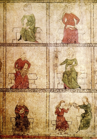 Der derzeitige Zustand entspricht den mittelalterlichen Verhältnissen: Die Darstellungen aus dem Ritterroman lagen und liegen auf der Südwand, die Weberfresken auf der Nordwand ein und desselben Raumes.